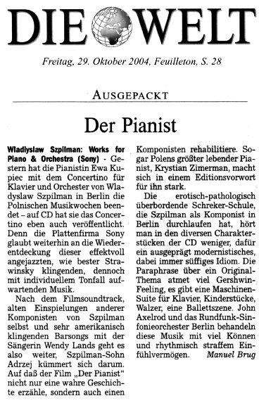 Dem Einsatz von Andrzej Szpilman, der 1983 Polen verließ und vor zwei Jahren als Mitarbeiter des Polnischen Rundfunks nach Warschau zurückkehrte, ist es zu verdanken, dass einige der verschollenen Kompositionen Wladyslaw Szpilmans wieder aufgefunden werden konnten. Die Partituren des noch aus der Vorkriegszeit stammenden Stücks "Walzer im alten Stil sowie das 1940 entstandene ???Concertino für Klavier und Orchester hatte Wladyslaw Szpilman noch selbst rekonstruieren können. Sein Violinkonzert hofft Andrzej Szpilman in Los Angeles zu finden, wo es vor dem Krieg von den Geigern Bronislaw Gimpel, Roman Torenberg und Konrad Winawer aufgeführt worden war. Was bisher an klassischen Partituren gesammelt werden konnte, ist im Musikverlag Boosey & Hawkes erschienen, wo auch die Klavierminiaturen herauskommen werden, die Szpilman für Kinder komponierte. Von Szpilmans Songs ist soeben bei Sony in den Vereinigten Staaten eine CD fertiggestellt worden, interpretiert von Wendy Lands. Und wie Andrzej Szpilman hervorhob, ???ist es das erste Mal in der Musikgeschichte, dass polnische Songs in Amerika gecovert werden. (Die Tagespost)
