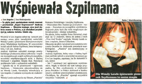 Album zatytulowany "Wendy Lands Sings the Music of the Pianist - Wladyslaw Szpilman" ukazal sie&Mac254; nakladem Hip-O Records nalezacej do koncernu Universal. Producentem albumu jest John Leftwitch, który wraz z Andrzejem Szpilmanem wybral kanadyjska piosenkarke Wendy Lands by zaspiewala piosenki Szpilmana. Lands, która w rodzinnej Kanadzie cieszyla sie spora popularnoscia niedawno przeniosla sie do Los Angeles.