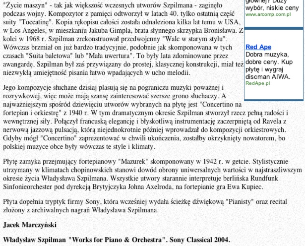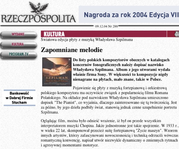 W dniu 12 marca br. dziennik "Granma" w krotkiej informacji pt. "Odkryc muzyke Pianisty" poinformowal, ze Andrzej Szpilman, syn Wladyslawa Szpilmana, promuje album z romantycznymi piosenkami z "Pianisty", "popularnymi przebojami w Polsce lat 40-tych i 50-tych". Dzialajac - wg "Granmy" - "z tym samym oddaniem, z jakim sprawil, ze wydane zostaly zapomniane wspomnienia jego ojca", na podstawie ktorych Polanski nakrecil swoj film, A. Szpilman stara sie obecnie, aby swiat poznal takze muzyke jego ojca. Informacji towarzyszy kadr z filmu i zaznaczone jest, ze "Pianista" zdobyl juz szereg nagrod. Wiadomosc podano za agencja Reutersa. (www.msz.gov.pl/file_libraries/39/3905/030317.doc)