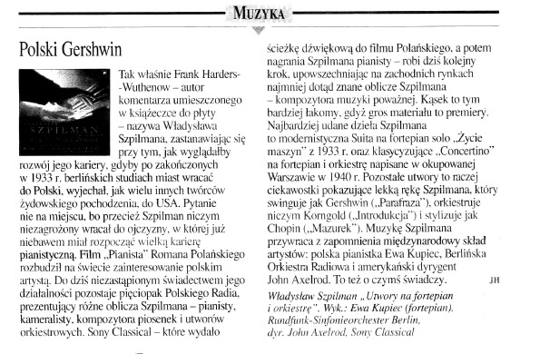 Zupelnie slusznie "Pianista" otrzymal w Cannes Zlota Palme - pisze A. Zurbriggen w "Berner Zeitung" ("Muzyk skazany na cisze", 9.10.). Film jest poruszajacy nie tylko dlatego, ze opowiada prawdziwa historie cudownego ocalenia, ale tez dlatego, ze obiektywnie przedstawia takze "dobrych" Niemcow, a "zlych" Zydow i Polakow. Recenzje uzupelnia wywiad z synem Wladyslawa Szpilmana, Andrzejem ("Film zastepuje mi rodzinny album"), ktory przyznaje, ze ojciec nie chcial pamietac o tragicznych przezyciach i ukrywal przed nim swa przeszlosc. Gdy w wieku 12 lat Andrzej Szpilman odkryl przypadkiem swe pochodzenie, przezyl kryzys. Dopiero w wieku 16 lat zrozumial, ze jest czlowiekiem, jak kazdy inny. Zrodlaa owczesnego kryzysu wyjasnia nastepujaco: "W 1939 r. w Polsce praktycznie wystawiono Zydow do odstrzalu. Od tamtej pory kryminalne bandy uzywaly sobie na nich i przez lata w narodzie polskim uksztaltowal sie rodzaj pogardy do Zydow. Wielu ludzi gardzi slabszymi. Dzieje sie to podswiadomie i niekoniecznie jest objawem antysemityzmu. W kazdym razie dopiero dzisiaj zmienia sie nastawienie Polakow do Zydow. (...) "Pianista" odgrywa w Polsce wazna role. To pierwszy film, ktory pokazuje cierpienia tej grupy narodowosciowej. Dzieki niemu Polacy zaczynaja identyfikowac sie ze swoja zydowska przeszloscia. W koncu zamordowani w Polsce Zydzi byli Polakami, ktorych przodkowie zyli w tym kraju od 500 lat!". (www.msz.gov.pl/file_libraries/39/2654/021018.doc)