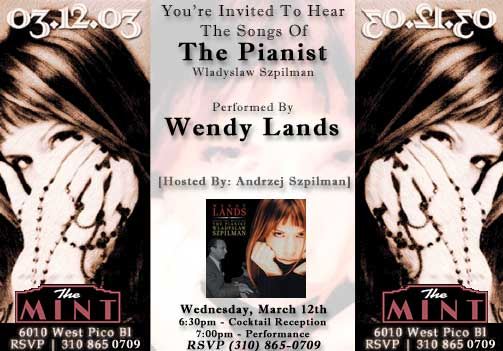 The CD, entitled Wendy Lands Sings The Music Of The Pianist Wladyslaw Szpilman, features a dozen songs from the composer's catalogue of about 500 songs.